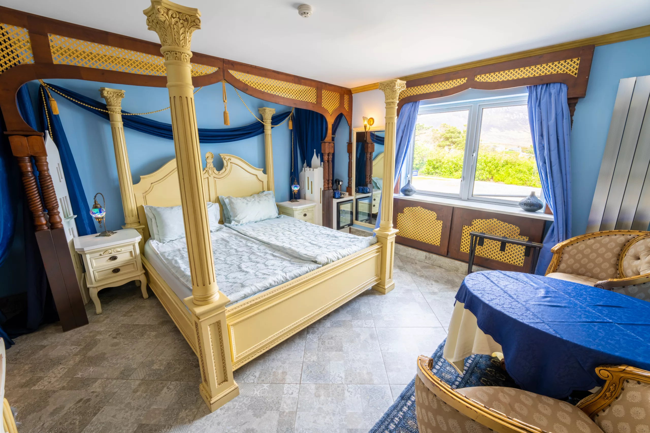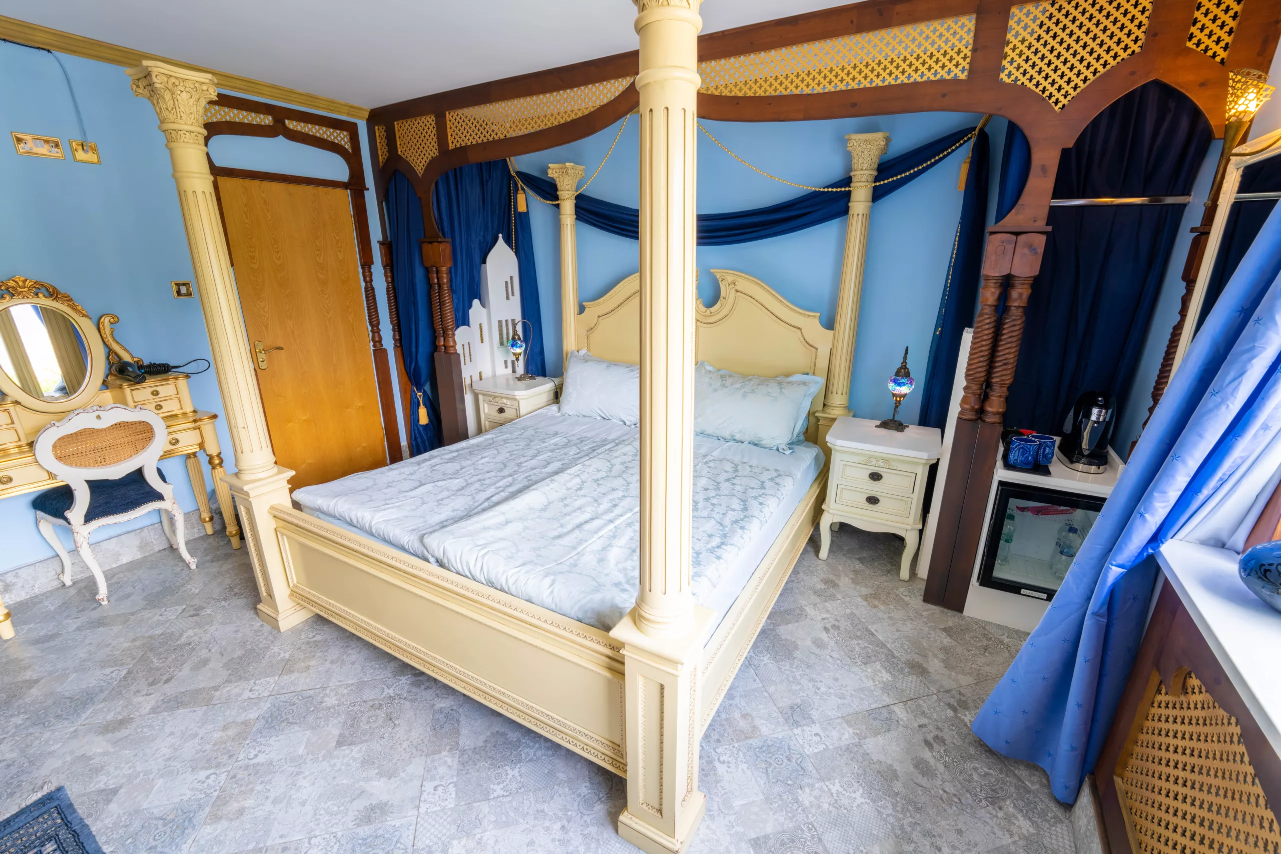 As-salāmu Ê¿alaykum to the orient with our newly arabian themed kasbah room. Once you enter this sanctuary you feel the soft touch of the orient with natural colours and well appointed furnishings. A stunning layout has been created with fantastic new floor. Two specially created comfy chairs and a super king-size bed gives the impression of being on a pilgrimage to far away lands in a past time. All furnitures have been hand crafted in soft beige tones with blue accessories – a small newly dressed ensuite with shower is to the left of the kasbah. This room is the back and side of the house and you can see Slievemore and keel lake in the distance.